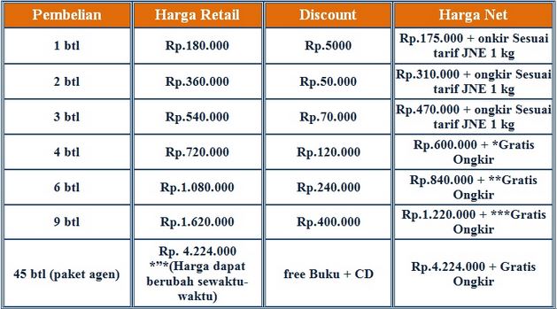 - Untuk pemesanan 2 botol keatas, minimal kami menerima DP setengahnya dari harga total baru barang kami kirim. Setelah barang di terima baru anda dapat melunasi sisa pembayarannya.